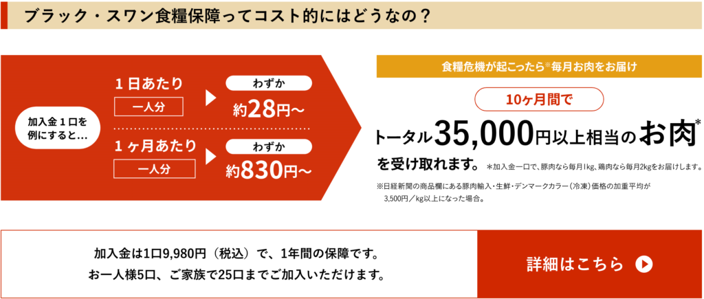 食糧危機が発生した際に、お肉を10ヶ月に渡って受け取れる【ブラックスワン食糧保障】
